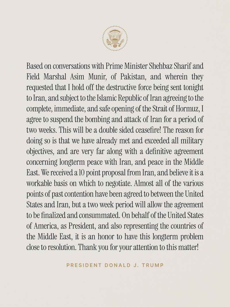 මෙම සති දෙකක කාලය ට්රම්ප් විසින් හඳුන්වා දී ඇත්තේ "ද්විපාර්ශ්වික සටන් විරාමයක්" (Double-sided Ceasefire) ලෙසයි. ඉරානය විසින් ඇමෙරිකාවට ඉදිරිපත් කර ඇති 'කරුණු 10 කින් යුත් සාම යෝජනාව' (10-point proposal) සාකච්ඡා සඳහා කදිම පදනමක් බව ට්රම්ප් පවසා ඇත. ඇමෙරිකානු ප්රහාරයක් අපේක්ෂාවෙන් සූදානම් වී සිටි ඉරානයට මෙමගින් විශාල සහනයක් ලැබී ඇති අතර, හෝමුස් සමුද්ර සන්ධිය හරහා ගමන් කරන නැව් වලින් තීරුබදු ලබා ගනිමින් තම යුද හානි යථා තත්ත්වයට පත් කරගැනීමට ඉරානයට මින් අවස්ථාවක් සැලසෙන බව විදෙස් වාර්තා පෙන්වා දෙයි.