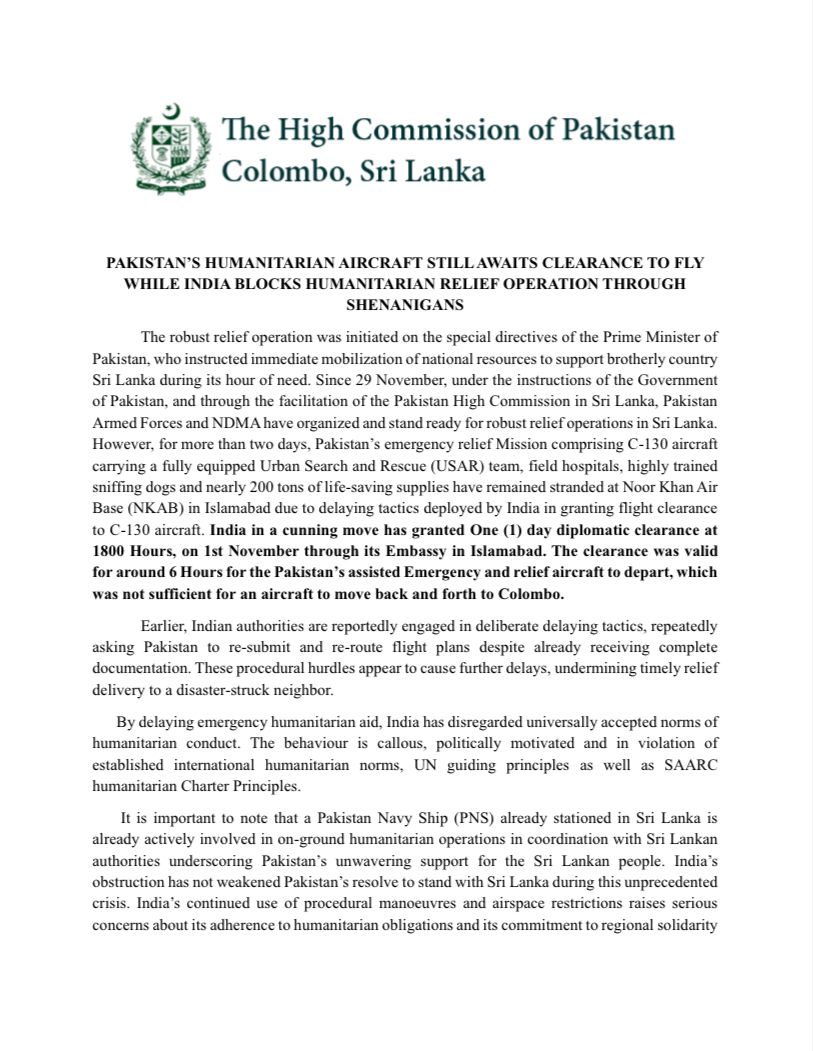 පකිස්ථාන විදේශ කාර්යාලය (FO) විසින් අද (දෙසැම්බර් 02) නිකුත් කරන ලද නවතම නිවේදනවල දැක්වෙන්නේ, ඔවුන්ගේ සහන ගුවන් යානයට ඉන්දීය ගුවන් ගමන් අවසරය ලැබීමට පැය 60කට වඩා වැඩි ප්රමාදයක් තවදුරටත් සිදුව ඇති බවයි. ඔවුන්ගේ මුල් නිවේදනයේ සඳහන් වූයේ ඉන්දියාව විසින් ලබා දුන් එක්දින රාජ්යතාන්ත්රික අවසරය ක්රියාකාරීව ප්රායෝගික නොවන බවත්, එය පැය කිහිපයකට පමණක් සීමා වූ බවත්ය.