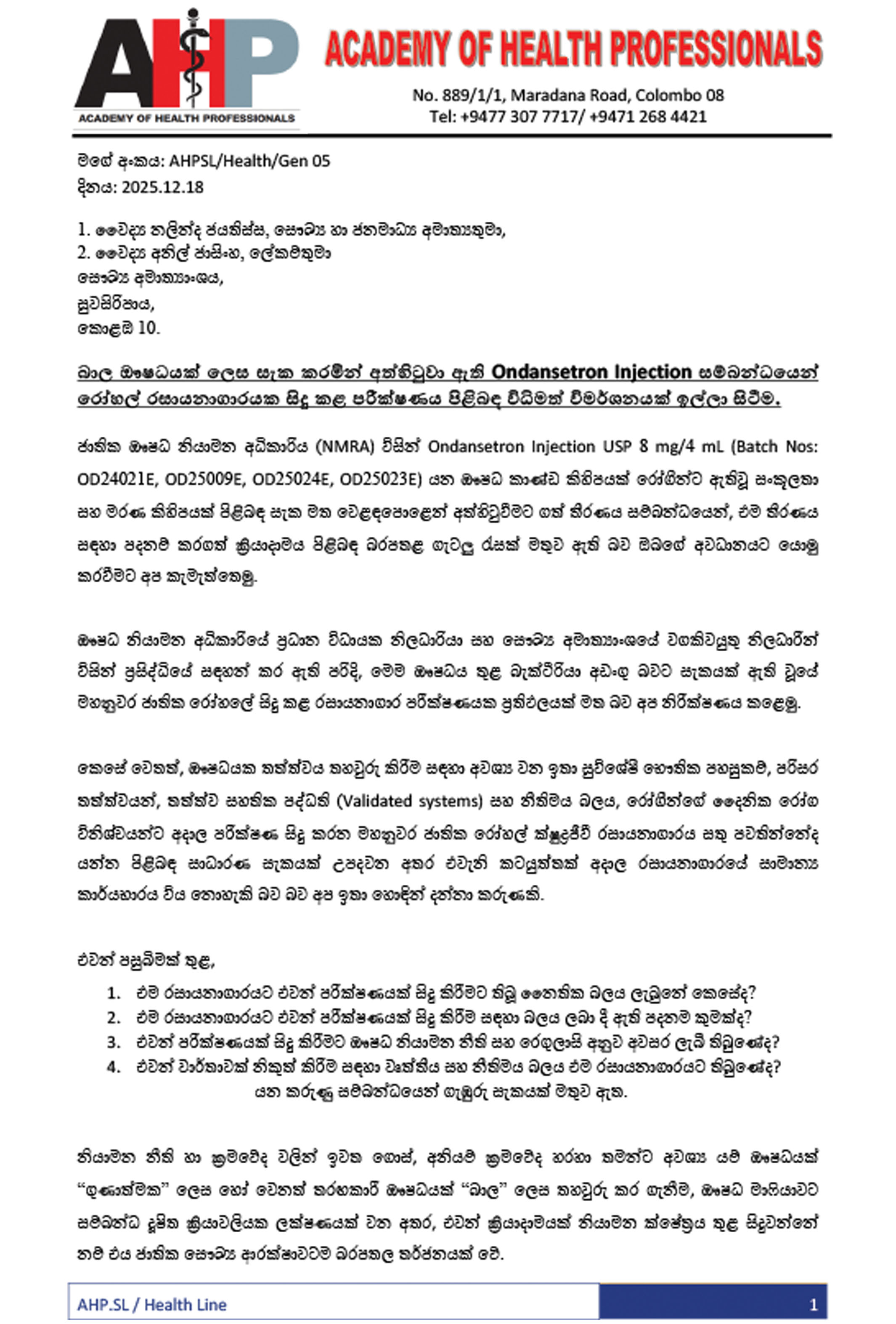- ප්රශ්නය: NMQAL ආයතනය තිබියදී, ඖෂධ නියාමන අධිකාරිය විසින් කිසිදු නීතිමය බලයක් නොමැති රෝහල් රසායනාගාරයක වාර්තාවක් පිළිගැනීමට තරම් හදිසි වූයේ මන්ද?