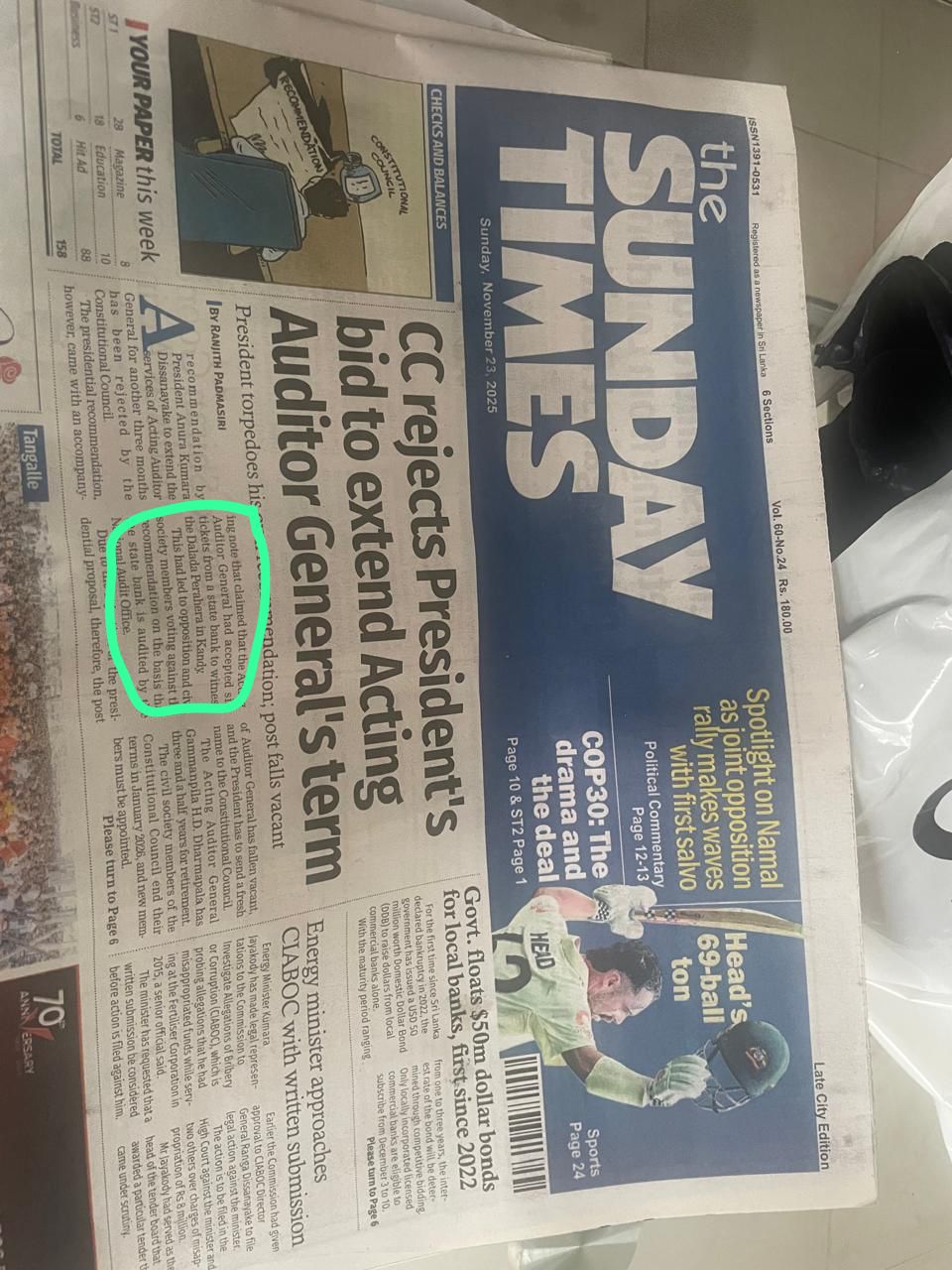 රජයේ විගණකාධිපති ධූරයට ස්ථිරව නිලධාරියෙකු පත් නොකර වත්මන් ආණ්ඩුව මේ වන විටත් මාස අටකට අධික කාලයක් ඉක්මවා ඇත. මෙතෙක් මෙරට කිසිදු පාලකයෙකු ඇඟිලි නොගැසූ ආකාරයට, ස්වාධීන විය යුතු විගණකාධිපති ධූරය දේශපාලනික හා ගජමිතුරු පාලනයකට ලක් කිරීමේ පැහැදිලි වෑයමක් මෙහිදී පෙනෙන්නට තිබේ. රාජ්ය මූල්ය විනය ආරක්ෂා කරන උත්තරීතරම තනතුරක් සම්බන්ධයෙන් සිදුකරන මෙම අවිනීත ක්රියාව වහාම නිවැරදි විය යුතුව ඇත.