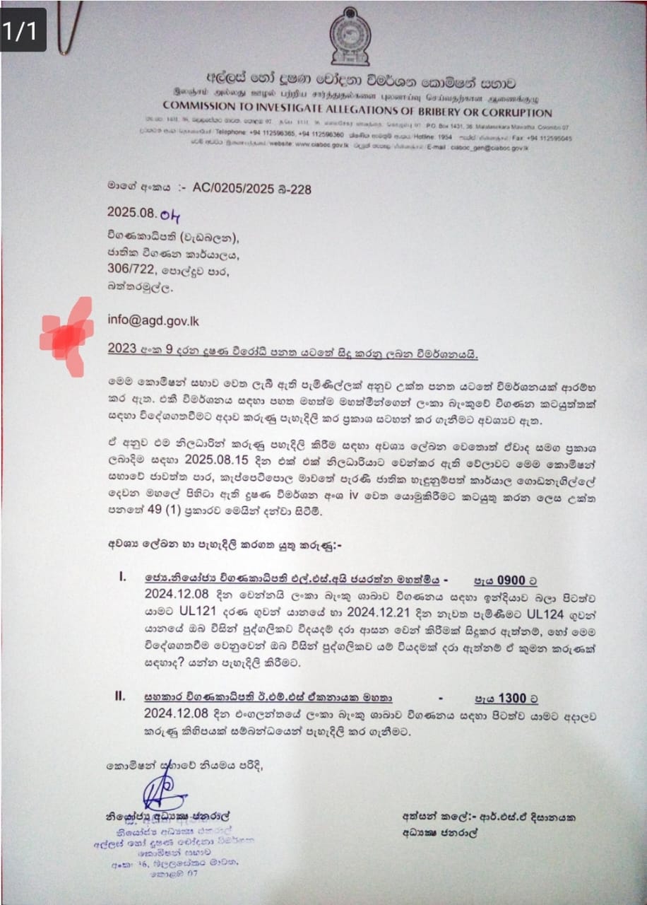 අල්ලස් හෝ දූෂණ චෝදනා විමර්ශන කොමිෂන් සභාව විසින් 2025.08.04 දිනැතිව (ලිපි අංක: AC/0205/2025 බී-228) ජාතික විගණන කාර්යාලය වෙත ලිපියක් යොමු කරමින් ඇයට එරෙහිව විමර්ශනයක් අරඹා ඇත. එම විමර්ශනයට පදනම් වී ඇත්තේ 2024.12.08 දින සිට 2024.12.21 දක්වා ඇය විසින් සිදුකළ ඉන්දීය සංචාරයක් සඳහා ගුවන් ටිකට්පත් (UL121 සහ UL124) ලබා ගැනීමේදී ඒවා පෞද්ගලික මුදලින් ලබා ගත්තේද නැතහොත් වෙනත් පාර්ශවයකින් අනුග්රහයක් ලැබුණේද යන්නයි. ලංකා බැංකු ශාඛාව විගණනය සඳහා යැයි පවසමින් සිදුකළ මෙම ගමන පිළිබඳව මේ වන විට බරපතල සැකයක් මතු වී තිබේ.