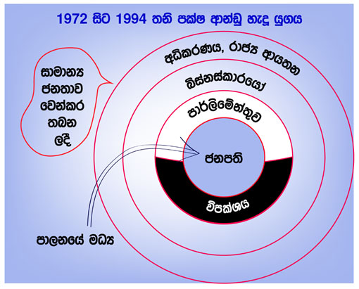 වසර 22ක් අගමැතිවරු 4ක් මෙම යුගයේ බලයට පත් විය. රනිල්ගේ ප්රථම ධුර කාලයෙන් අවසන් විය. තනි පක්ෂ ආණ්ඩු පිහිට වූ යුගයකි. නොයෙකුත් අළුත් පක්ෂ වැඩි වෙමින් පැවතින. පියාගෙන් පුතාට ලෙස මන්ත්රී කිරුළ හිමිකාරිත්වය ලැබුණේ ය. පැරණි පවුලේ වැඩිමලාගේ අවසරය සහිත නාගරිකයින් හා නගර ඇසුරු කරන්නන්ගේ පංතිය ප්රධාන විය. ඔවුහු තමන් “බිස්නස්මන්වරු“ ලෙස හඳුන්වා ගත්තේ ය. සාමාජිකයින් තනි පක්ෂයක් වටා ගොනු විය. පක්ෂ 40කට වඩා වැඩි විය. සියල්ලන් ම පැරණි සාමාජිකත්වය ට අනුව පක්ෂ ධූරාවලිය පිළිගත් යුගයකි. සුලු පක්ෂ විශාල ප්රමාණයක් හා ‘විශාල තනි පක්ෂ’ දෙකක් බිහි විය. අගමැති නමින් හැඳින්වූ පාලකයා ජනපති නමින් හැඳින්වූ අතර රාජ්ය පරිපාලනය සංකීර්ණ බවට පත් විය.