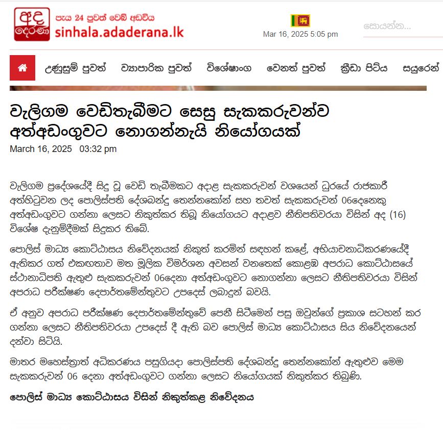 දින වකවානු නොමැතිව මේ ප්රවෘත්තිය පොලිස් මාධ්ය කොට්ඨාසය විසින් ඉදිරිපත් කර ඇත්තේ එම එකඟතාව හා නීතිපතිගේ උපදෙස මේ මෑතක දී සිදුවූවක් බව අනියමින් ඇඟවෙන පරිදි ය. හරියටම කියතොත්, එය දේශබන්දු ගේ පෙත්සම ඉදිරිපත් වී, ඒ ගැන පසුගිය සතියේ අභියාචනාධිකරණයේ සලකා බැලී, එහි තීන්දුව හෙට ලබාදීමට තීරණය වූවාටත් පසුව සිදුවූවක් ලෙසට ය. පොලිස් මාධ්ය නිවේදනයෙන් සමාජ මාධ්ය පමණක් නොව අනෙකුත් ප්රසිද්ධ මාධ්ය ද නොමග ගොස් ඇති බව මේ සමග අමුණා ඇති ප්රවෘත්ති වාර්තාවලින් පැහැදිළි වෙයි.