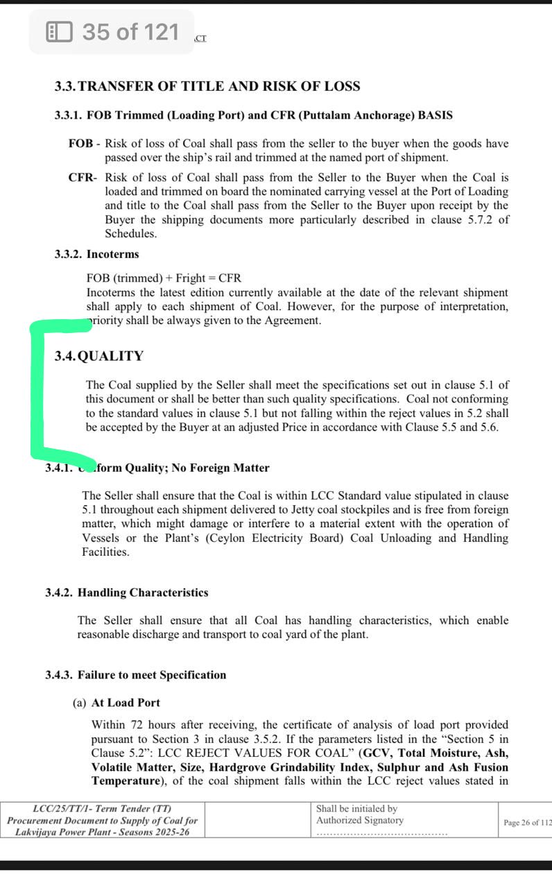 "ප්රතික්ෂේපිත සීමාවන් ඉක්මවා ගිය (Reject Limits) ගල් අඟුරු දැන දැනම බාරගන්නේ නම්, එමගින් බලාගාරයේ පද්ධතියට හෝ යන්ත්ර සූත්රවලට සිදුවන කිසිදු හානියක වගකීම සැපයුම්කරු බාර නොගන්නා බවයි."